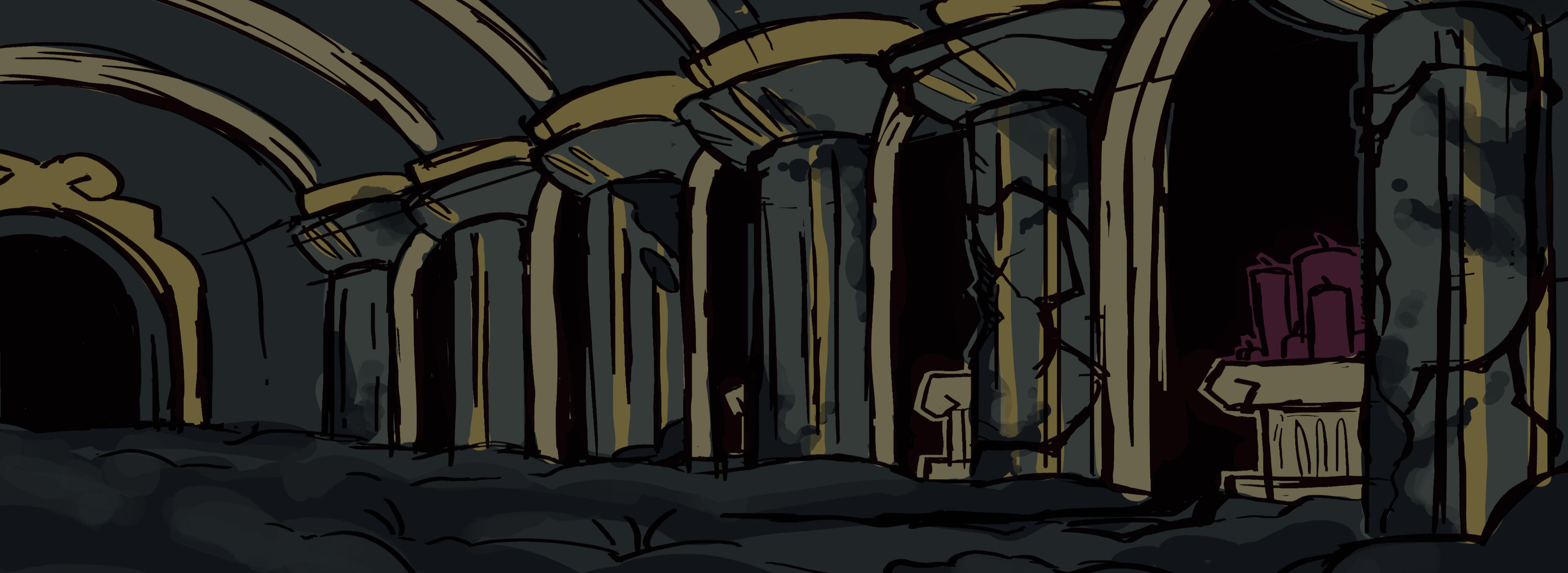 Sadly, it turns out drawing the same, highly detailed room over and over from multiple different angles is painful. Plus, our story went through massive changes and our artists yearned for something a little more 3D. There was only one sensible thing to do: pivot to 3D backgrounds! Above, you'll find all of the blockouts for our environments.