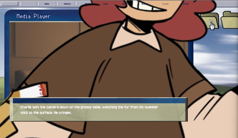We wanted to go for an old 2000's desktop for the UI given lost media's significance to the plot. After photobashing a reference, Yassets got to work, making the icons, textboxes, and battling the word spacing at the top. Since Ren'Py's GUI system is heavily embedded in the code, this was a joined effort between her and our coder.
