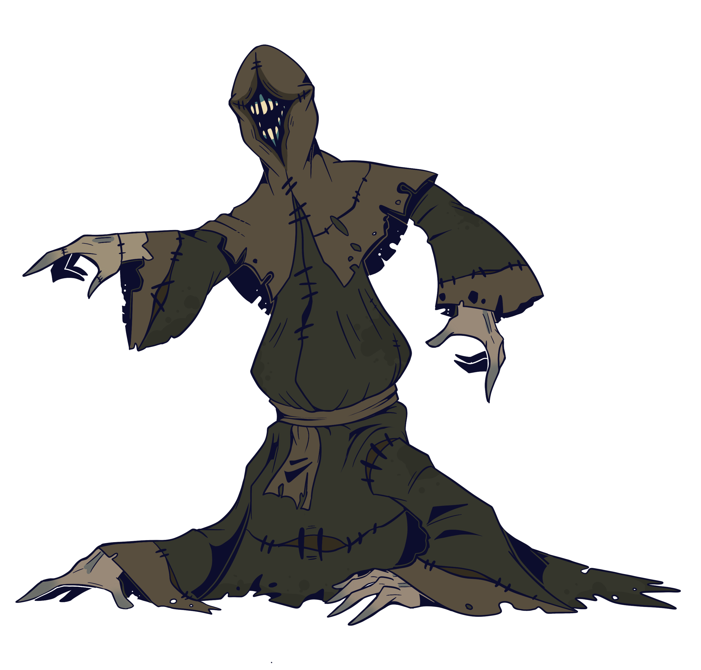 Initially, upon picking up the project again, we tried to revisit our first designs, merging them together. Then, when we finalized the setting at an abandoned cathedral, we revised again to impliment more spiritual traits. Design #3 featured a blocky hood and large, prayer-posing arms to resemble an upside down cross. Since our lovely lady is a corpse stealer that tunnels underground, we pushed for something more body bag-like and gave her mole teeth, restoring that recognizable glint of white in the darkness. Slapped some decaying, sickly yellow-greens on her, and she was ready to go.