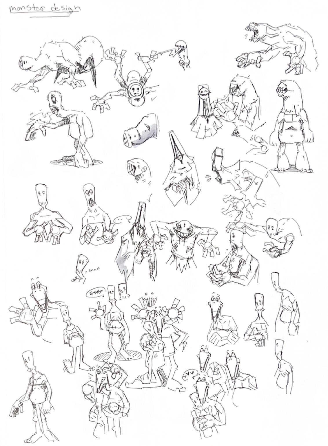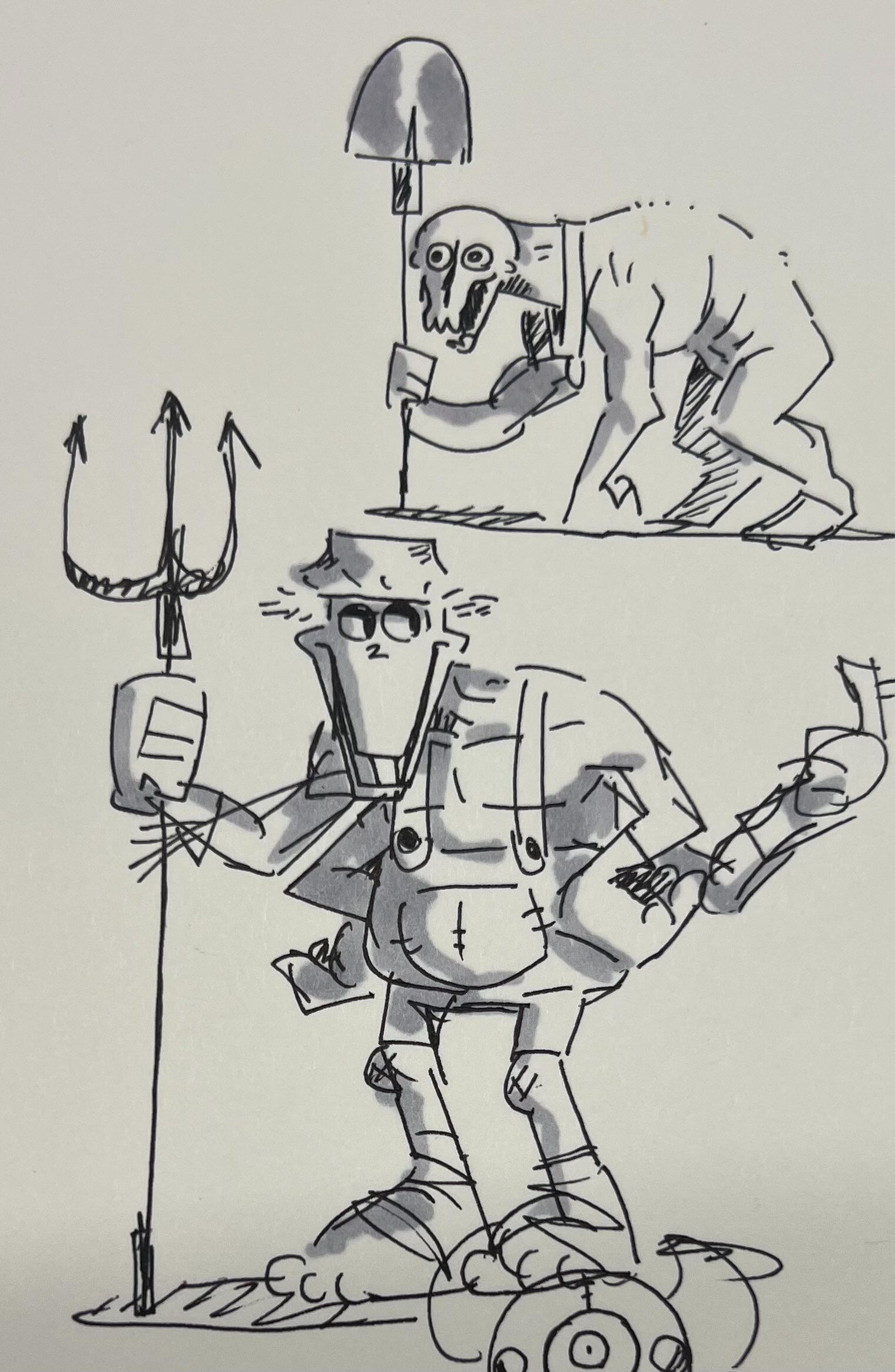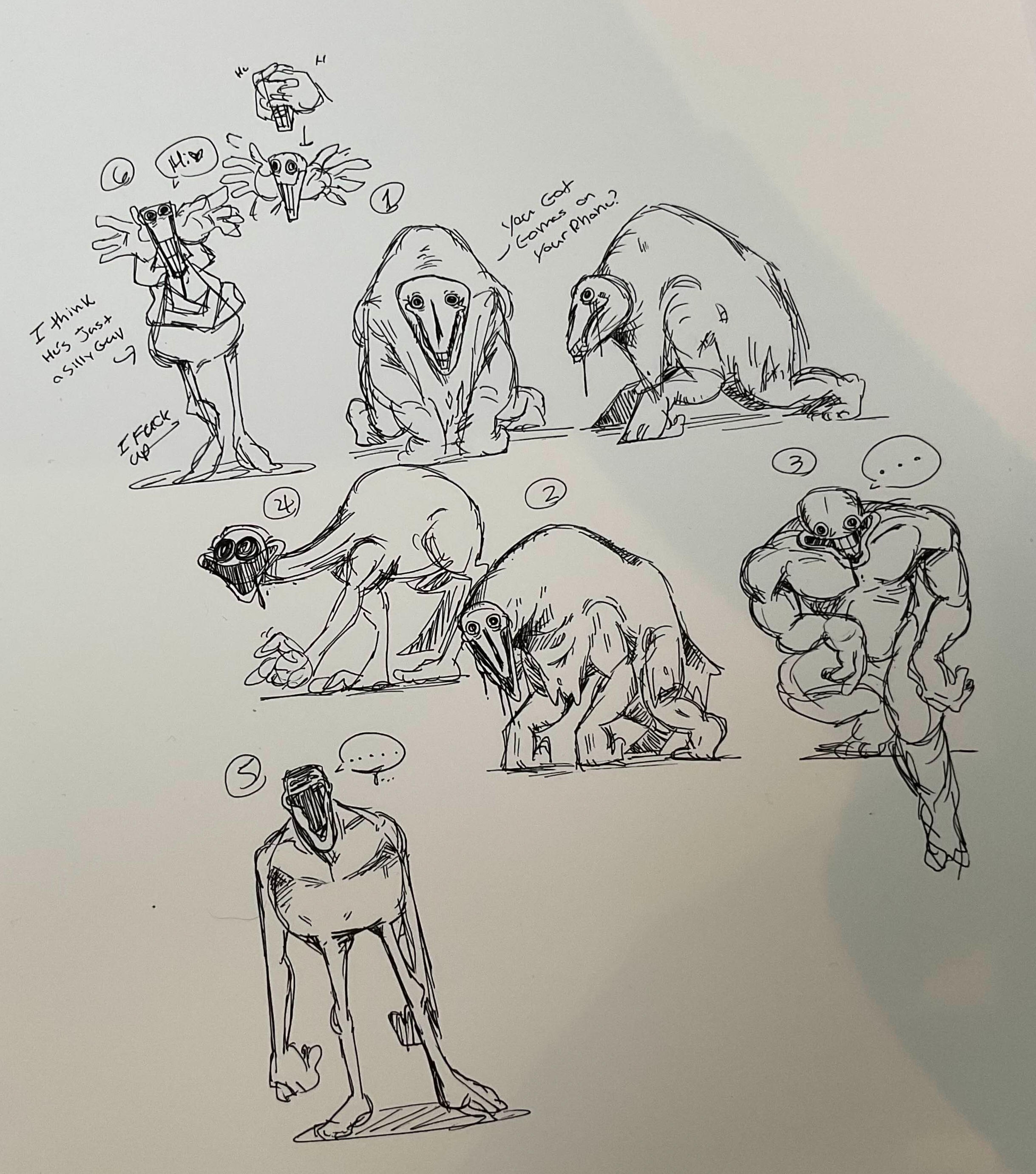 The Priestess, or as we call her, Girlboss, actually wasn't a priestess to begin with. In our original proof of concept, the spooky investigations took place in a haunted mineshaft. We weren't fully sure what direction to take it, only that we wanted something white to contrast the stark darkness in the tunnels. Thus, "The Dog" was born with his infamous skull-head and decaying body.The second rendered design, named "Mr. Peekaboo," was a concept that grossed the entire team out during the initial pitch. We blame the first drawing in the top left of the first loose sketch page. He was unfortunately scrapped both times since his design didn't quite fit the spiritual church theme.