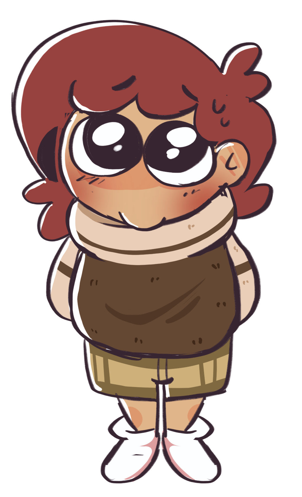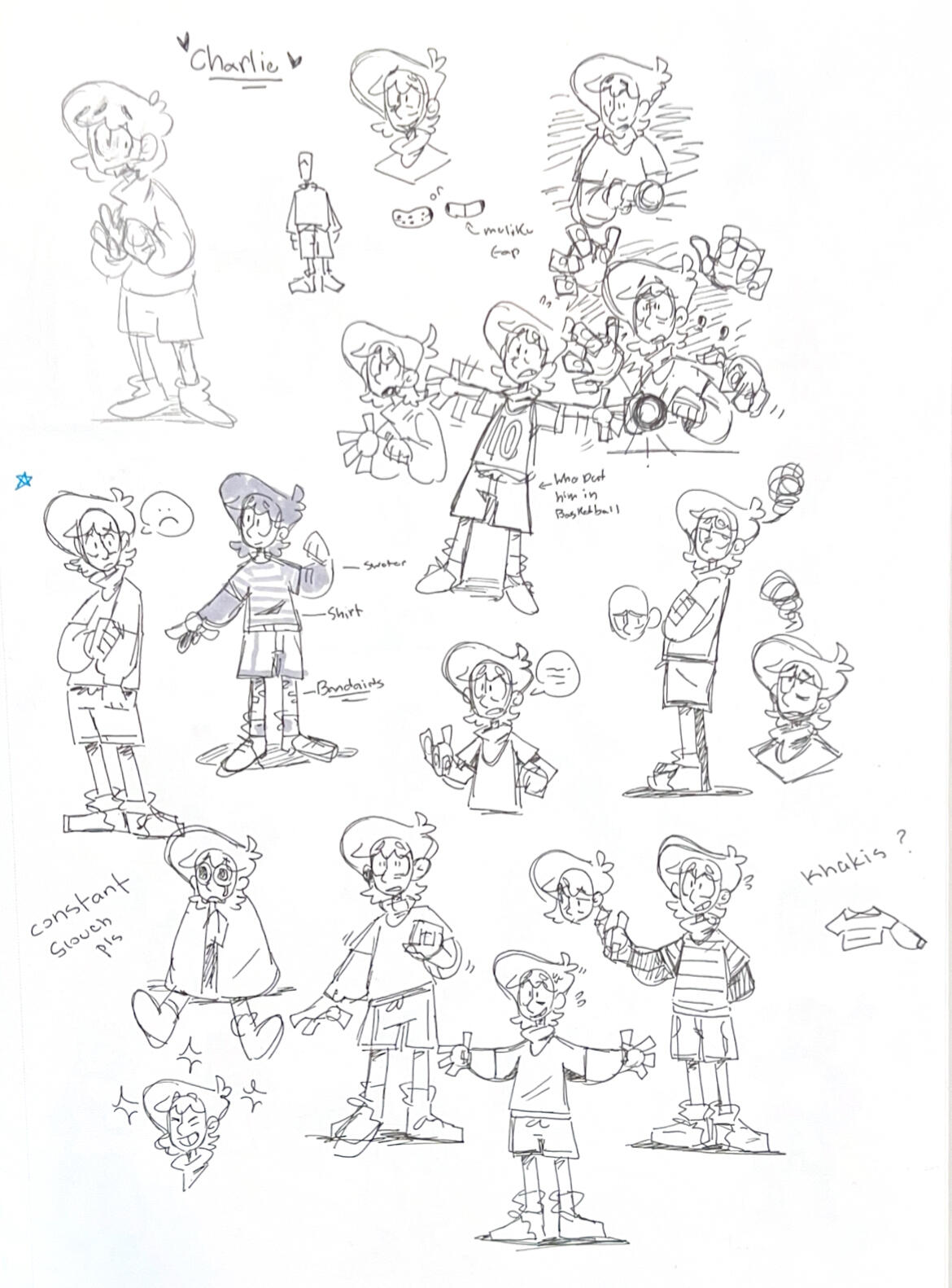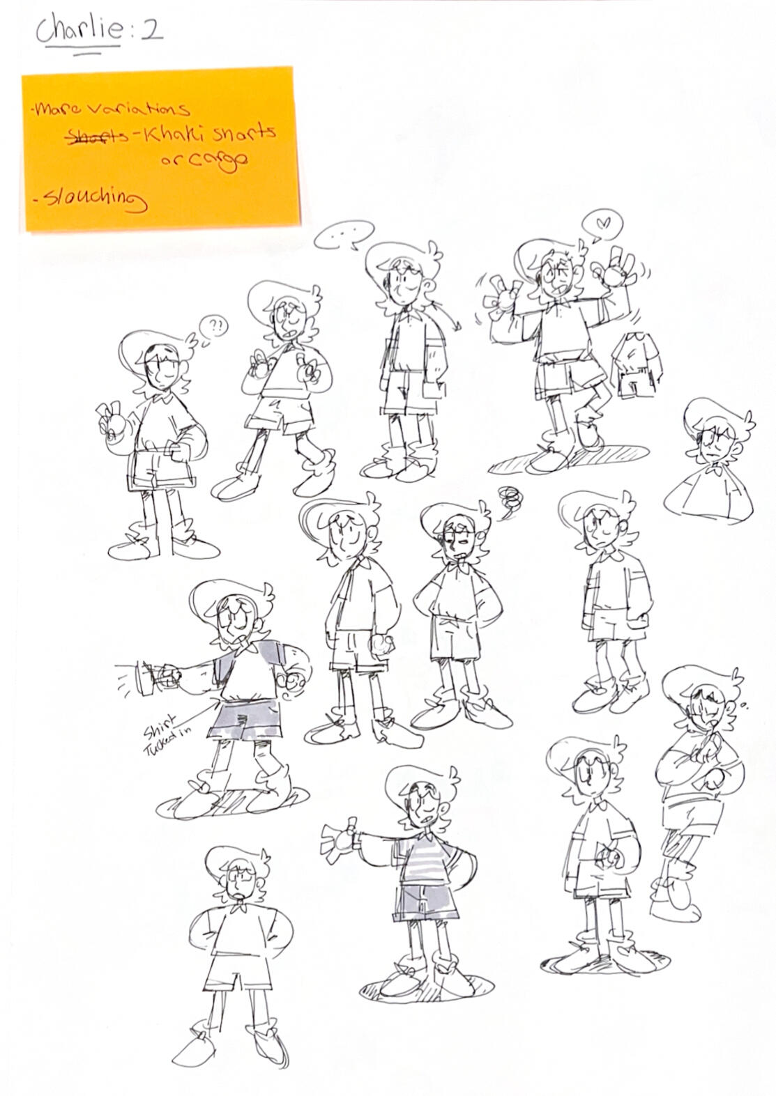 The first defining trait we gave Charlie was "soft, sweet pushover." In all honesty, this didn't change much over time. Since the first game started with a sleepover, he wore a cozy, casual sweater that he'd occasionally bury his face into. We also went with some gentle, grounding browns and yellows to push that warm, comforting tone.