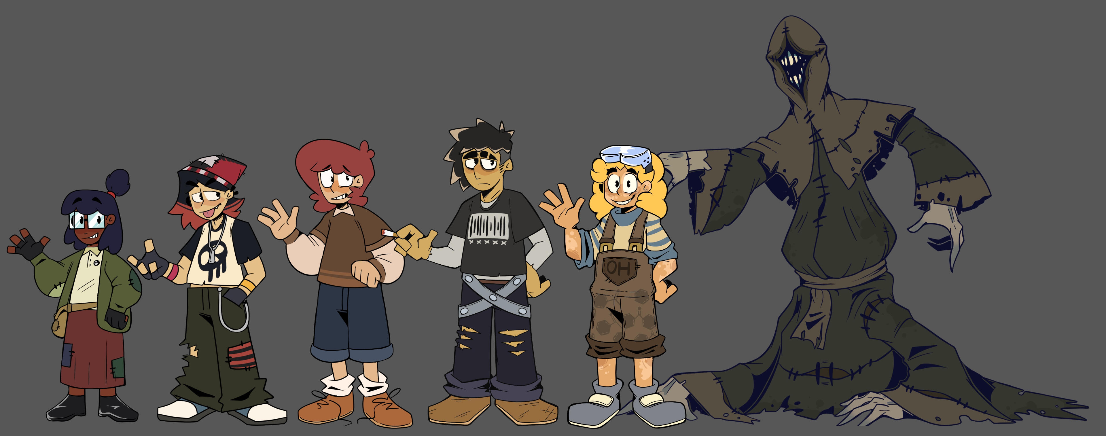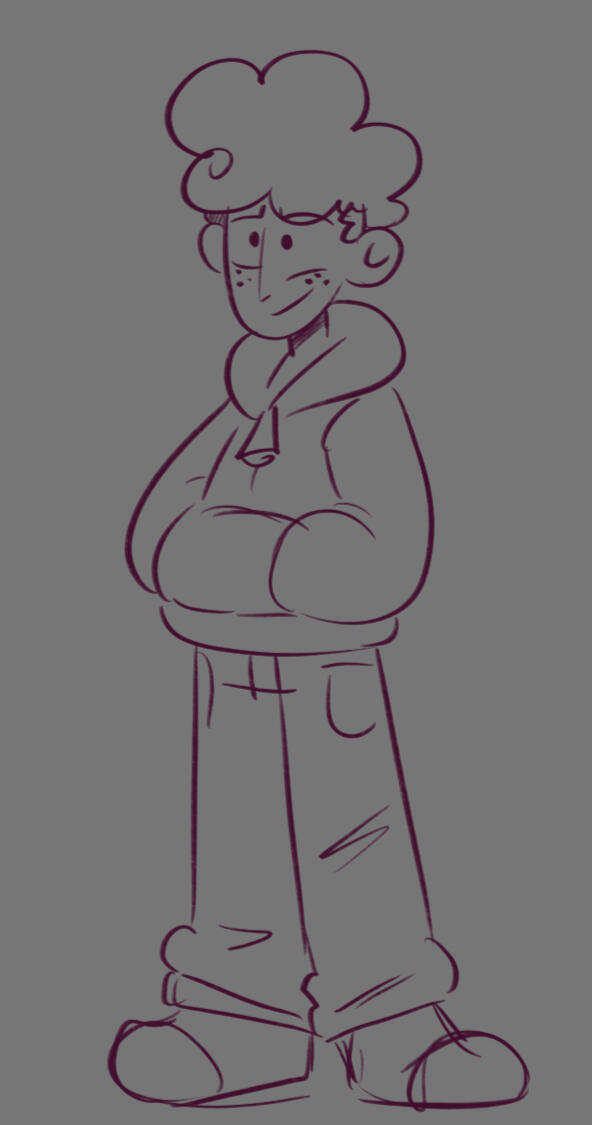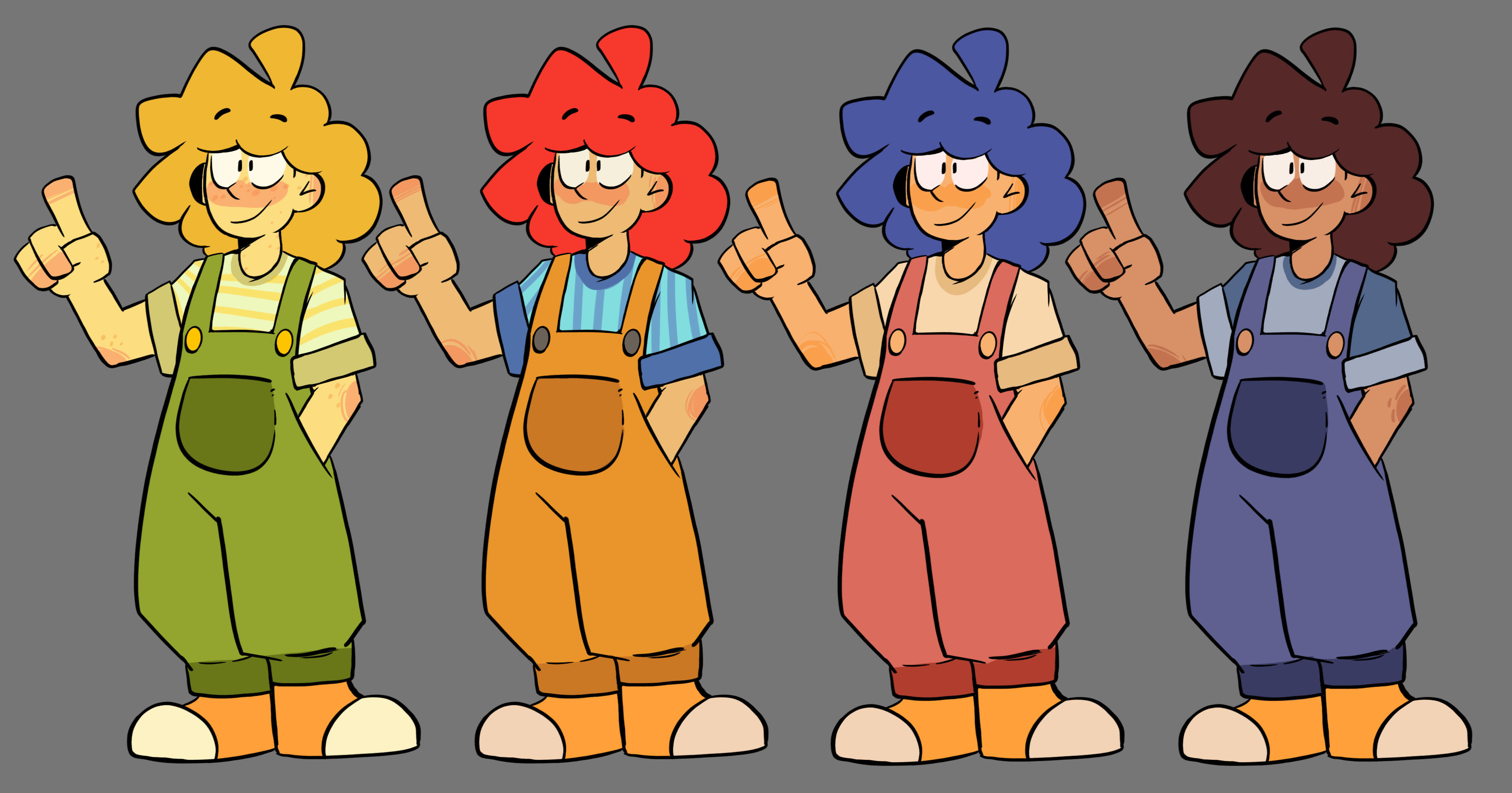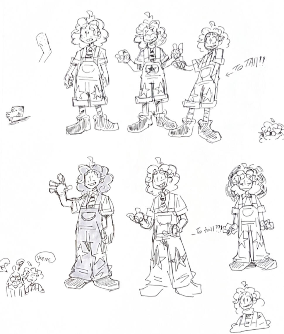 Finding the balance between sharp, unhinged edge and looking too villainous was difficult in the beginning. We also knew we wanted to give Harlow big, chunky pants to make his silhouette stick out against the others (and to break the little stick leg syndrome our cast was developing).You'll find a lot of dark green in their color concepts because like how Bea has touches of red in her design, they have some of her green in their palette. After all, what best friends wouldn't color swap just a little?