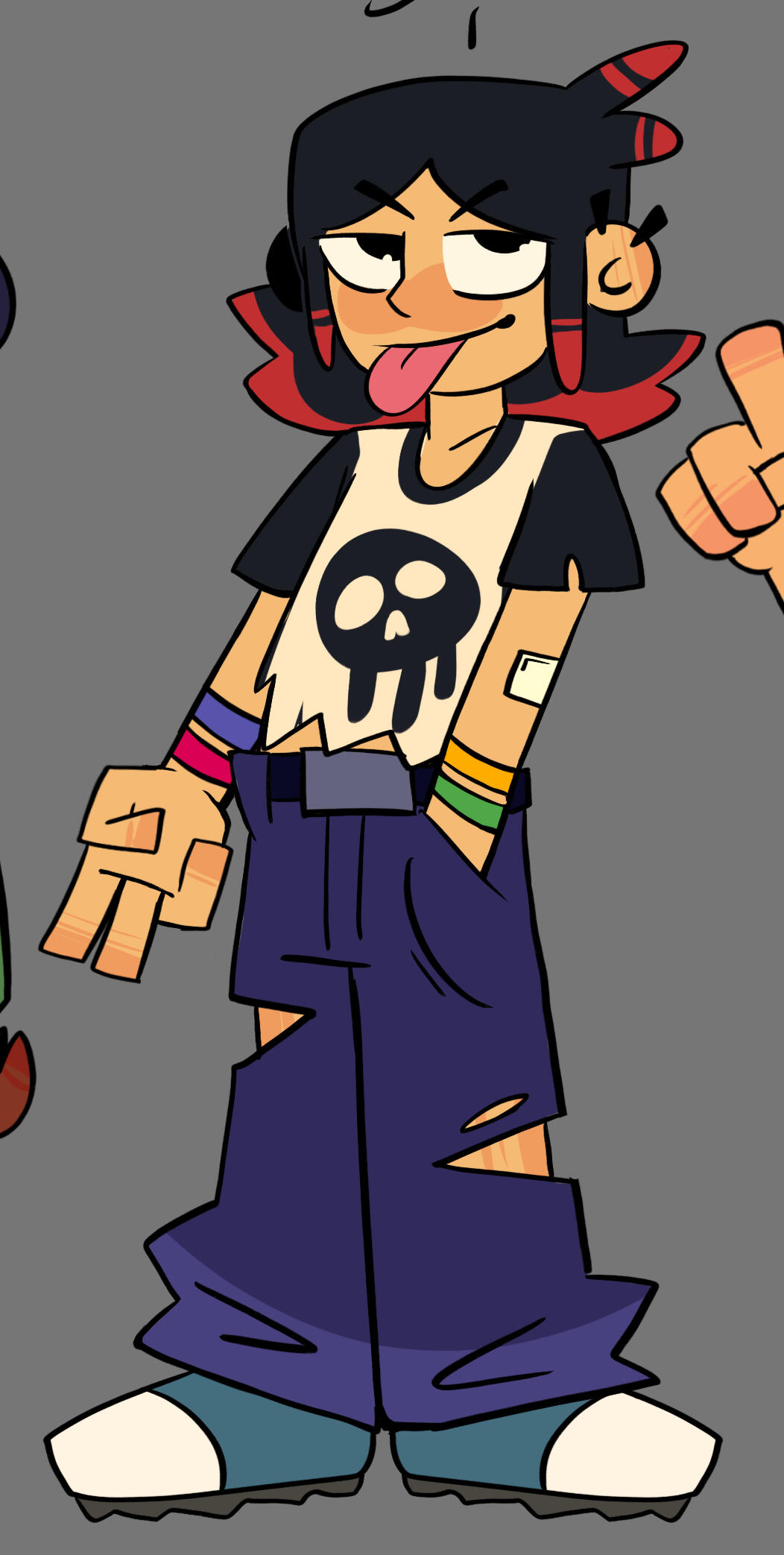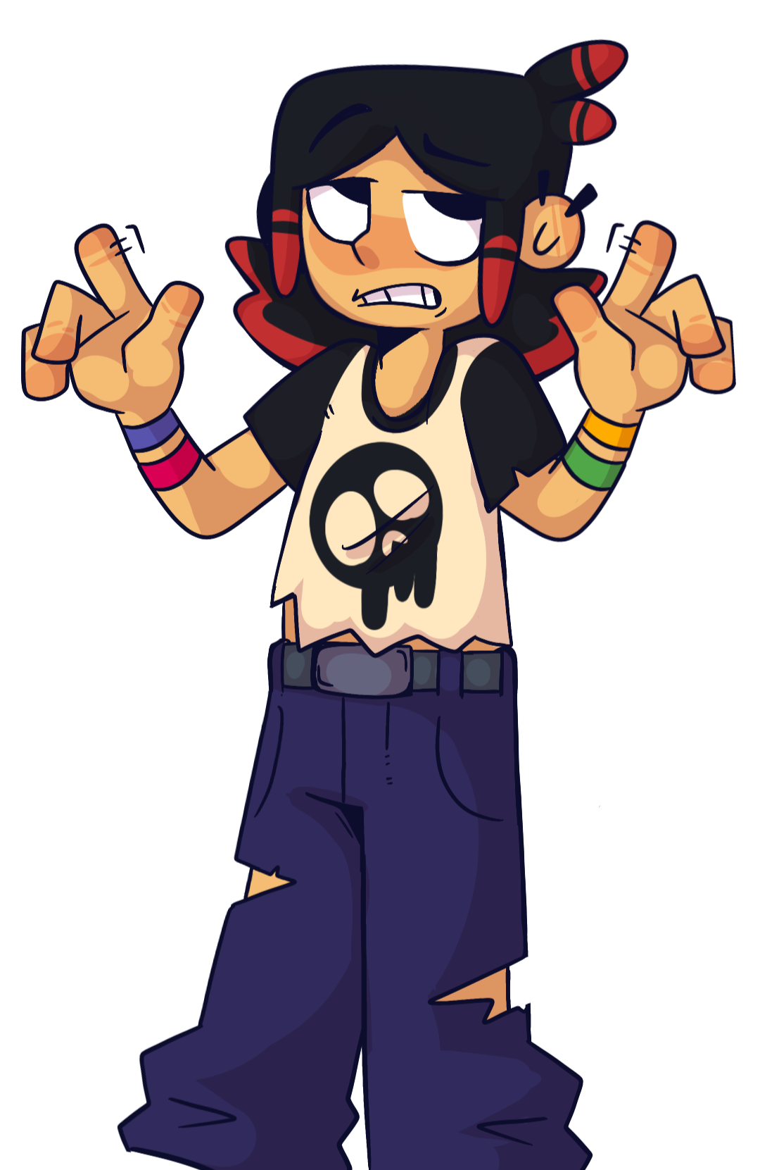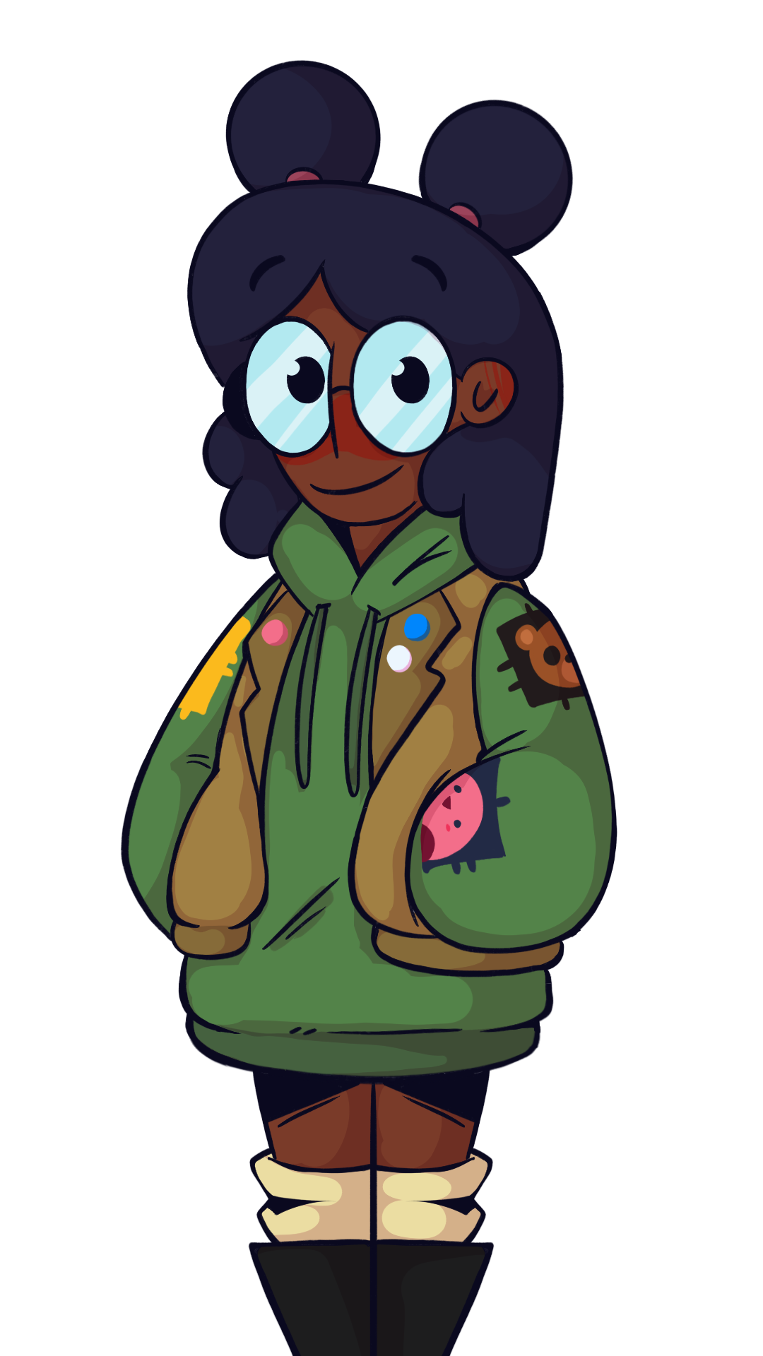 Given her obsession with everything occult, we really liked the idea of her hyperfixating on indie games like Five Nights At Freddy's. So, we gave her two buns to resemble Freddy's ears and a few sewn patches on her sleeve. She was also way more enthusiastic back then, so her shape language stayed round and squishy.