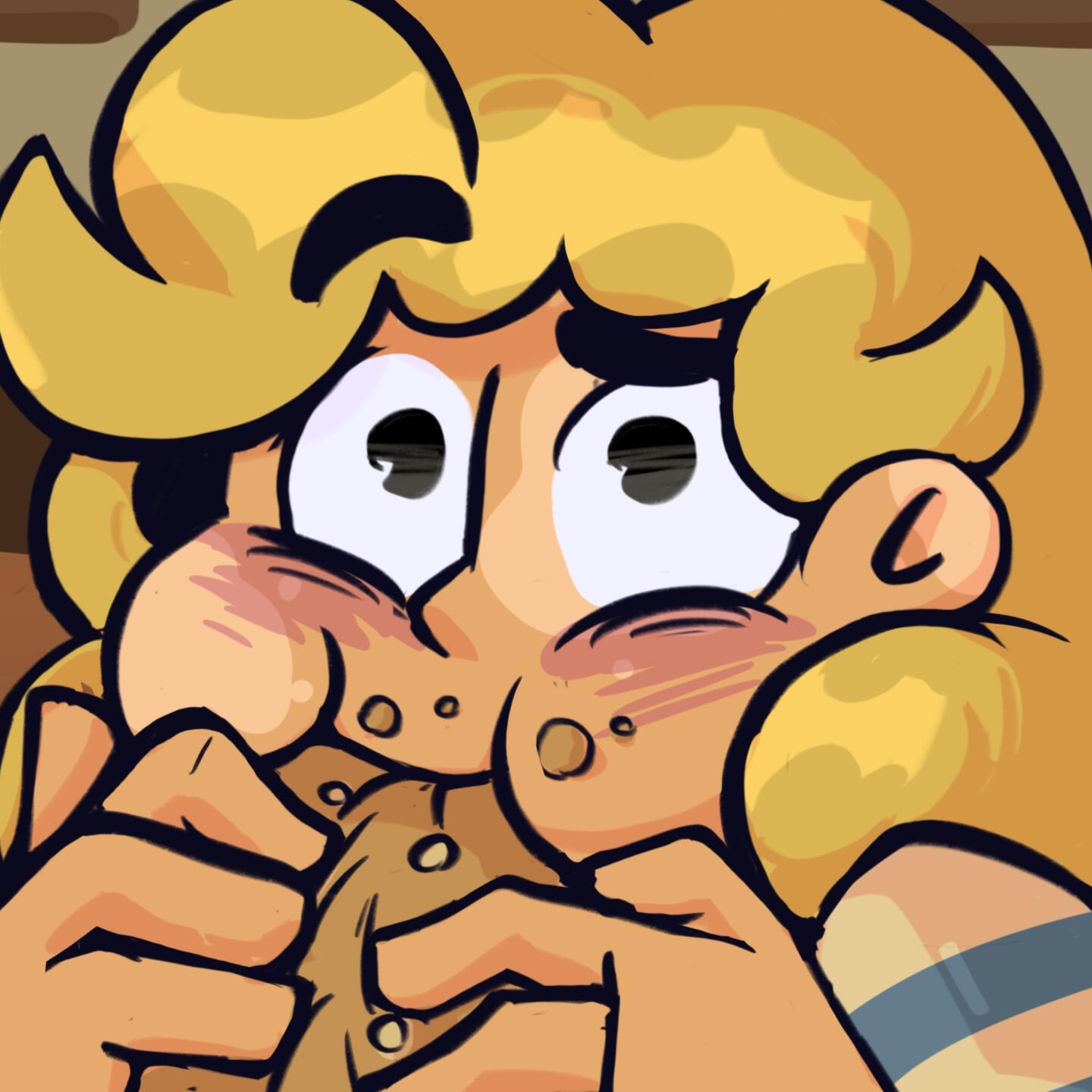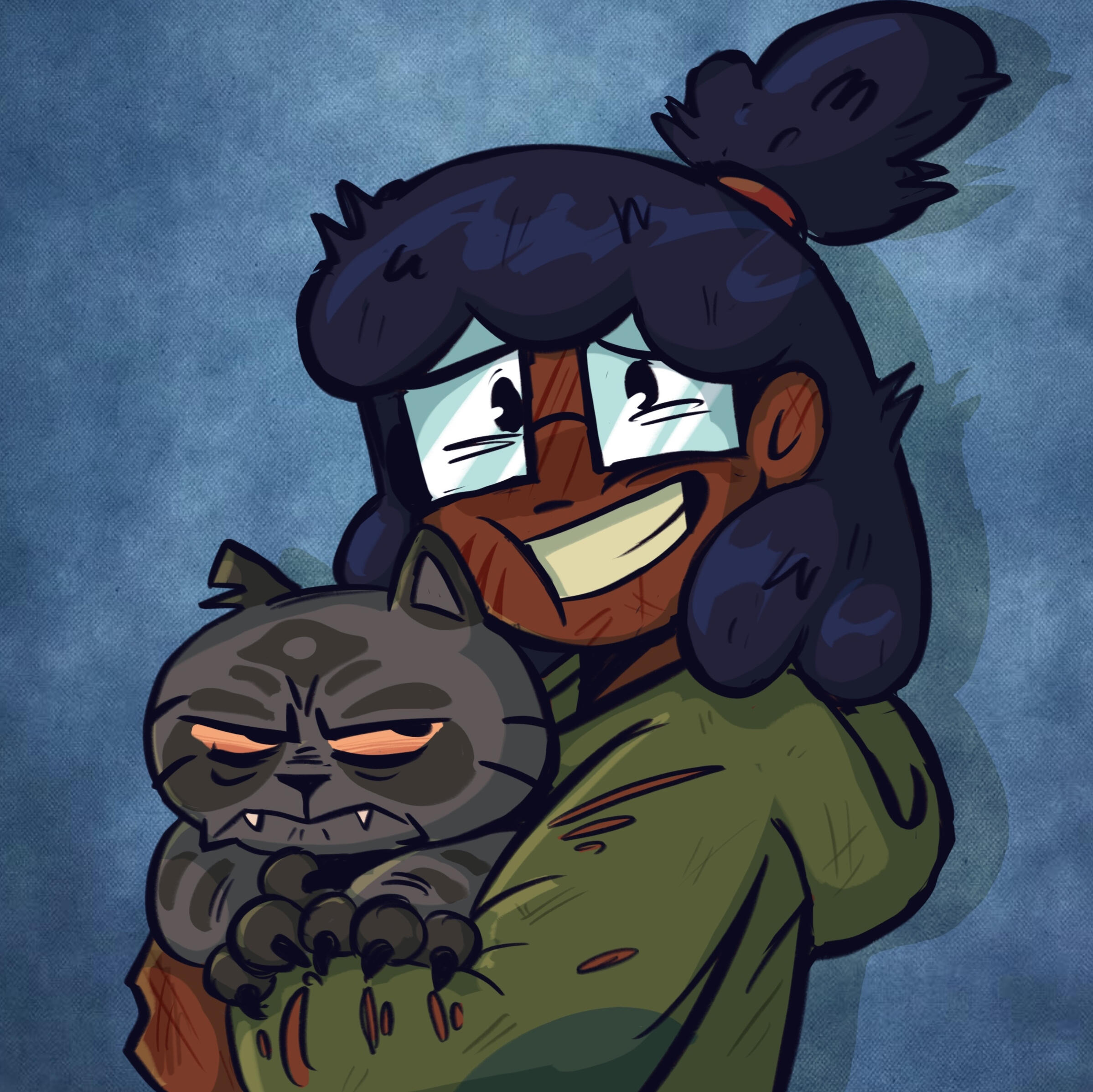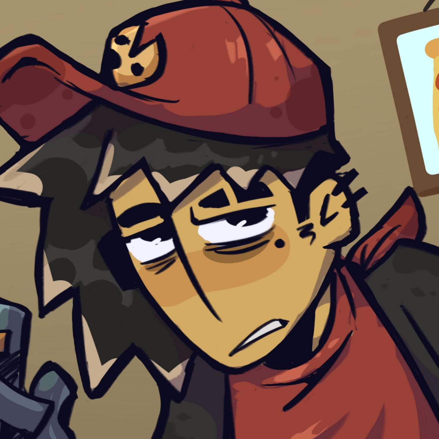Given her obsession with everything occult, we really liked the idea of her hyperfixating on indie games like Five Nights At Freddy's. So, we gave her two buns to resemble Freddy's ears and a few sewn patches on her sleeve. She was also way more enthusiastic back then, so her shape language stayed round and squishy.