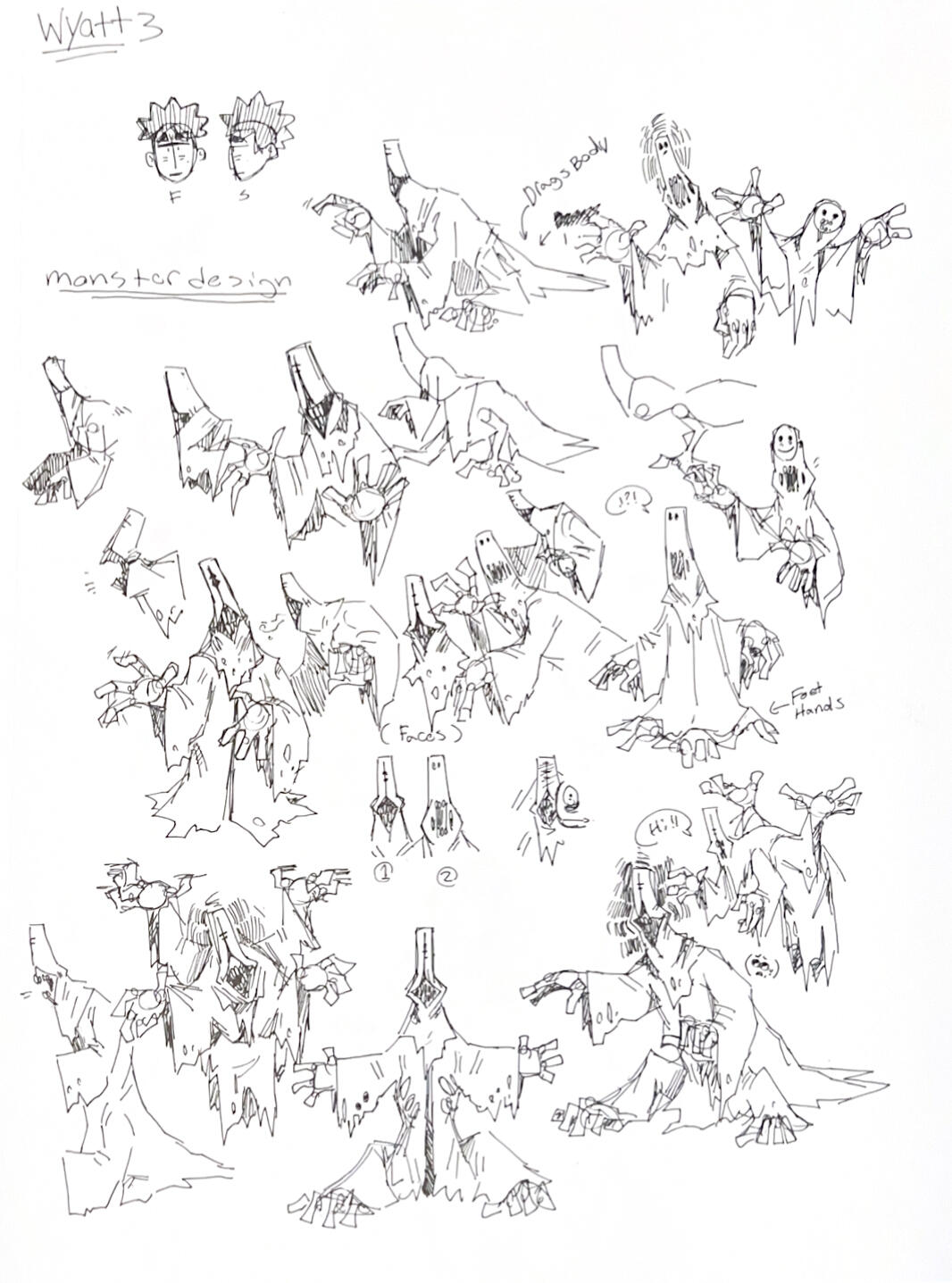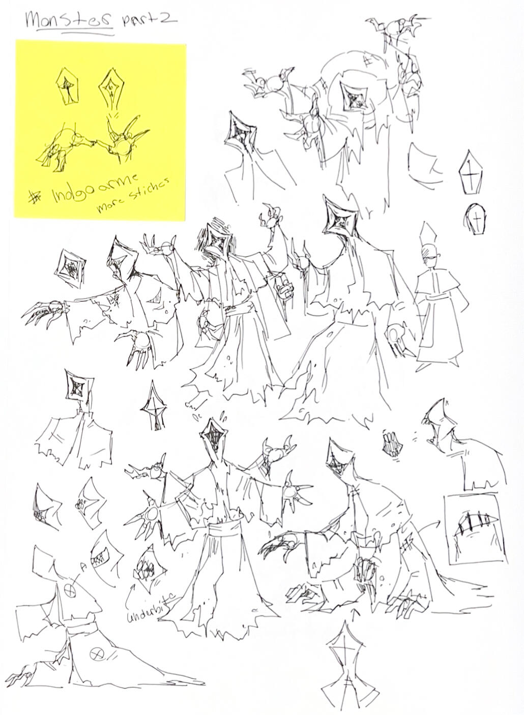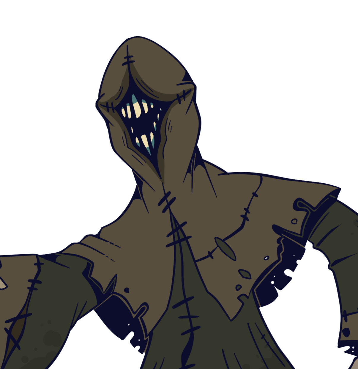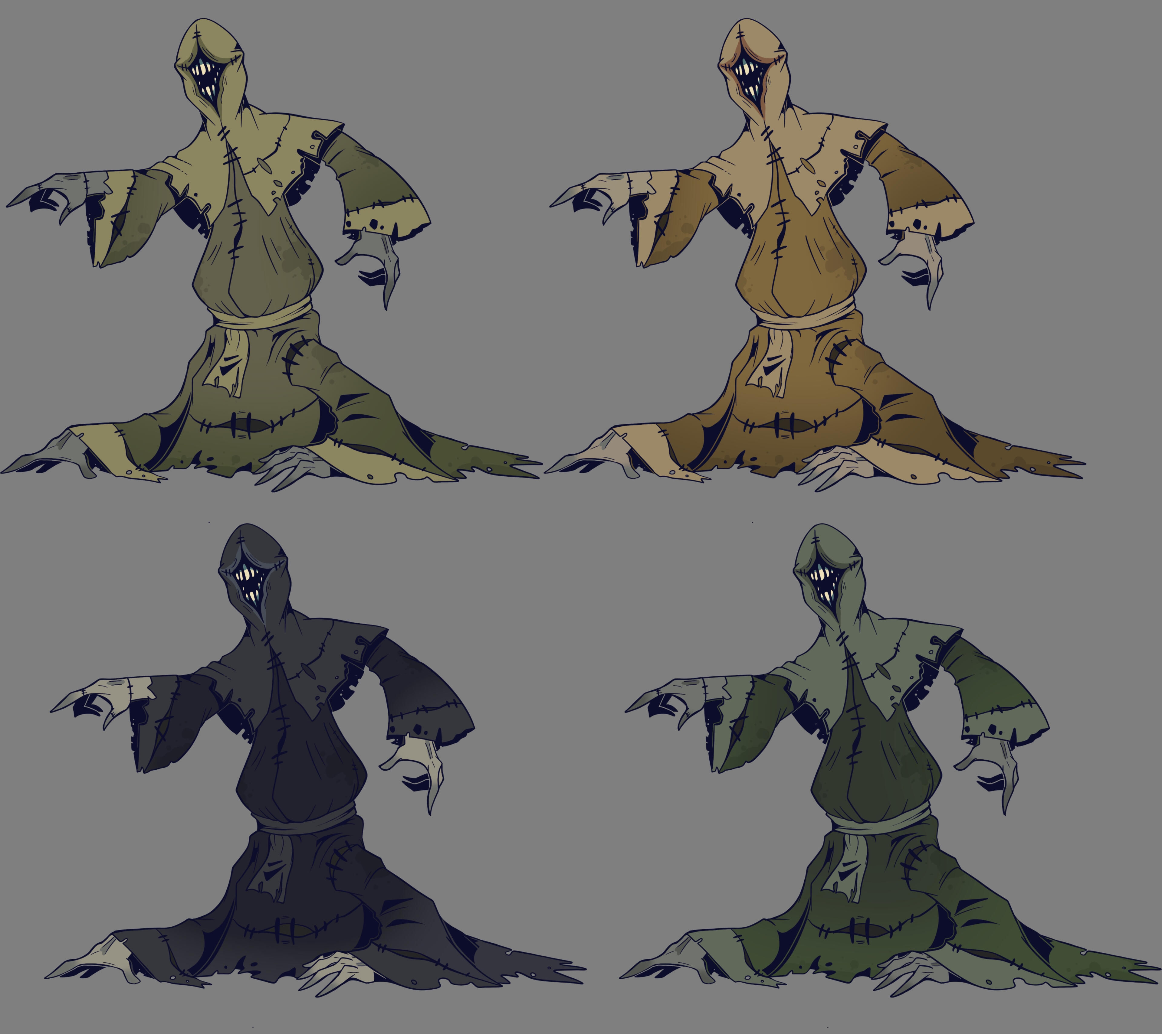 Initially, upon picking up the project again, we tried to revisit our first designs, merging them together. Then, when we finalized the setting at an abandoned cathedral, we revised again to impliment more spiritual traits. Design #3 featured a blocky hood and large, prayer-posing arms to resemble an upside down cross. Since our lovely lady is a corpse stealer that tunnels underground, we pushed for something more body bag-like and gave her mole teeth, restoring that recognizable glint of white in the darkness. Slapped some decaying, sickly yellow-greens on her, and she was ready to go.