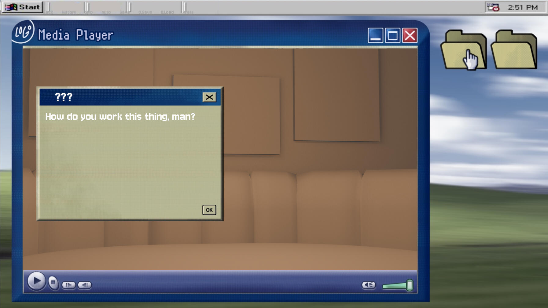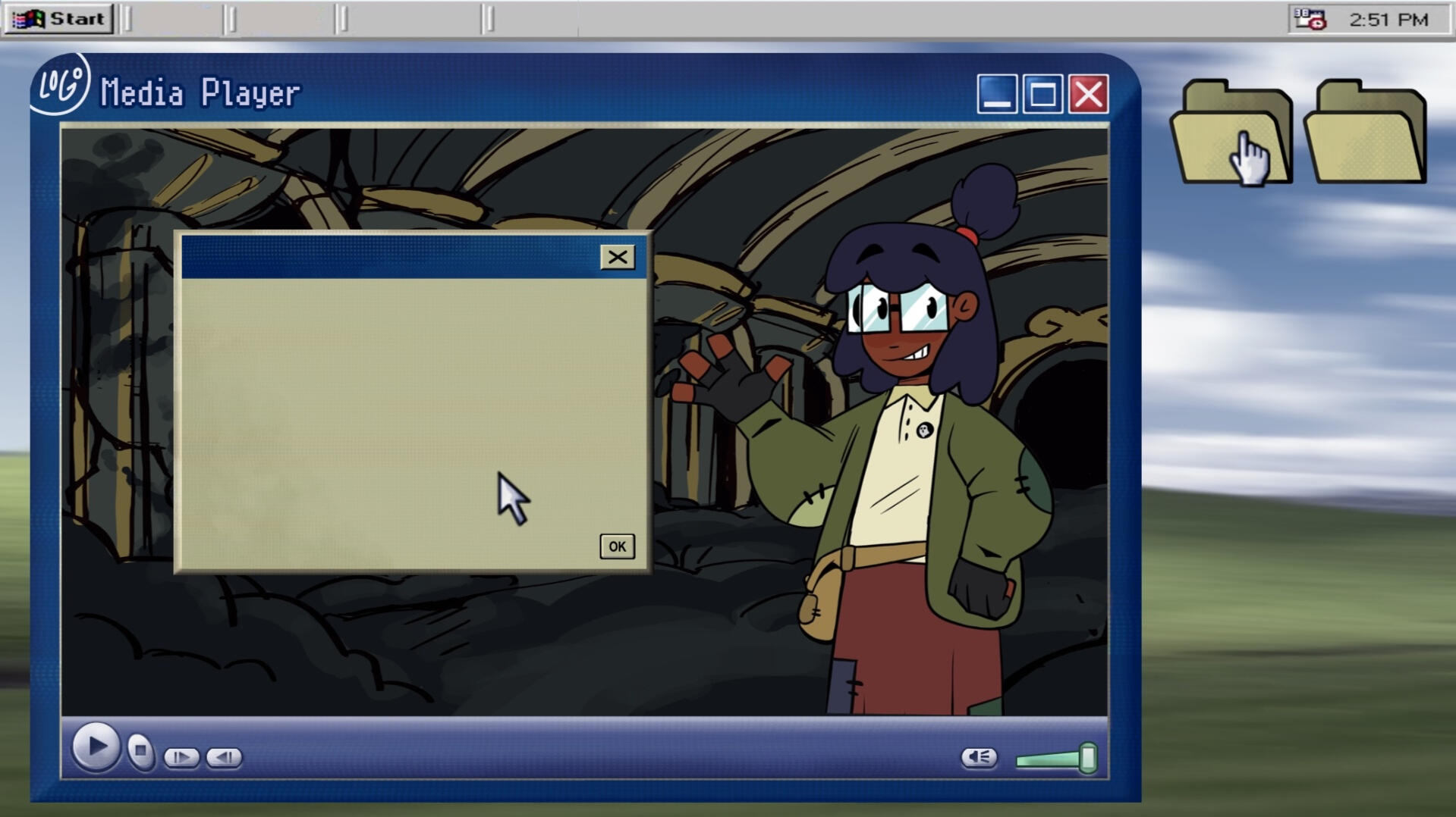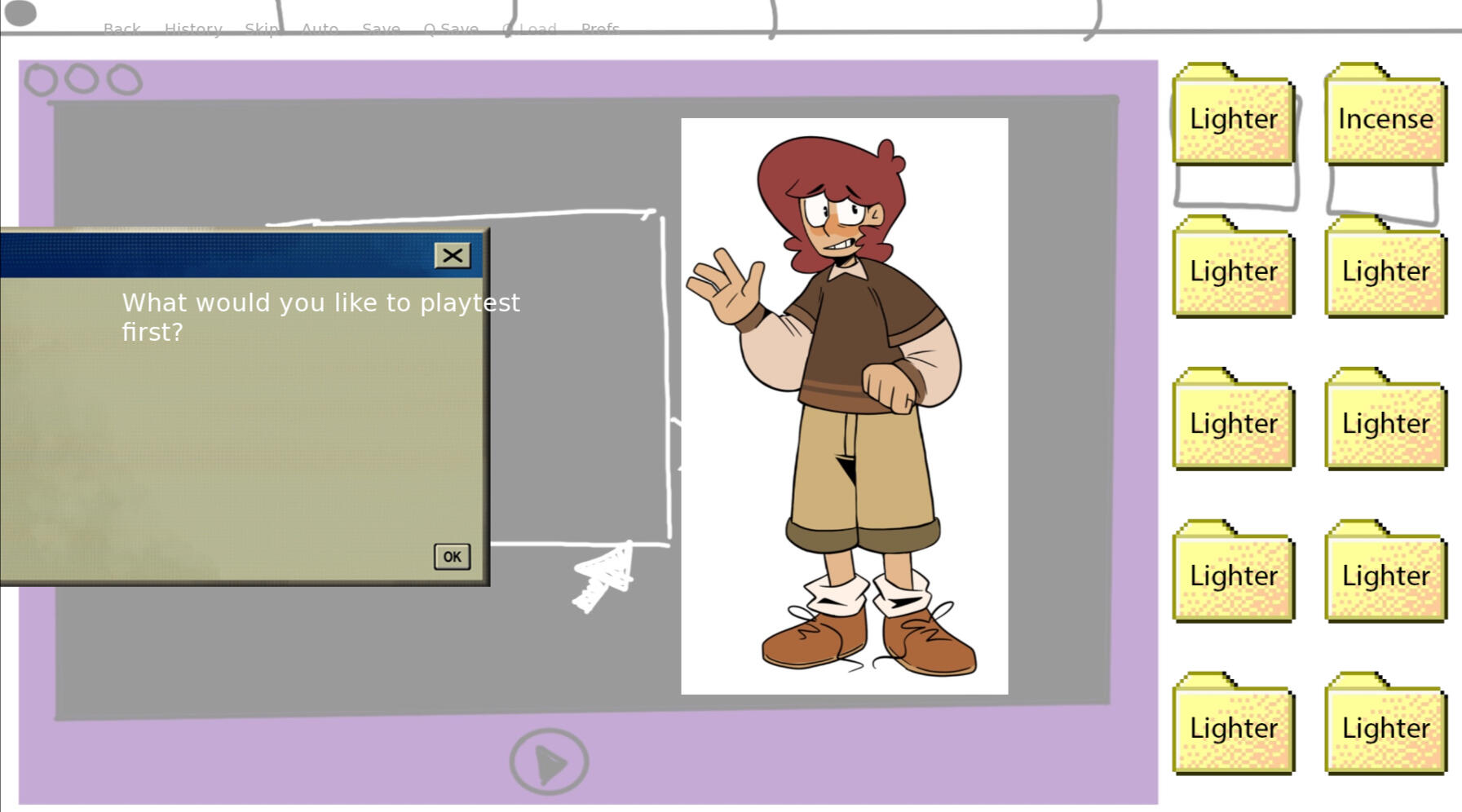 We wanted to go for an old 2000's desktop for the UI given lost media's significance to the plot. After photobashing a reference, Yassets got to work, making the icons, textboxes, and battling the word spacing at the top. Since Ren'Py's GUI system is heavily embedded in the code, this was a joined effort between her and our coder.